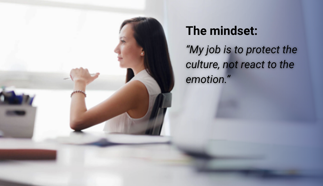 Anchor yourself. Before meeting, regulate your own emotions. Remember your goal is not to win the conversation, rather it’s to protect culture, uphold standards, convey respect, and preserve trust.
