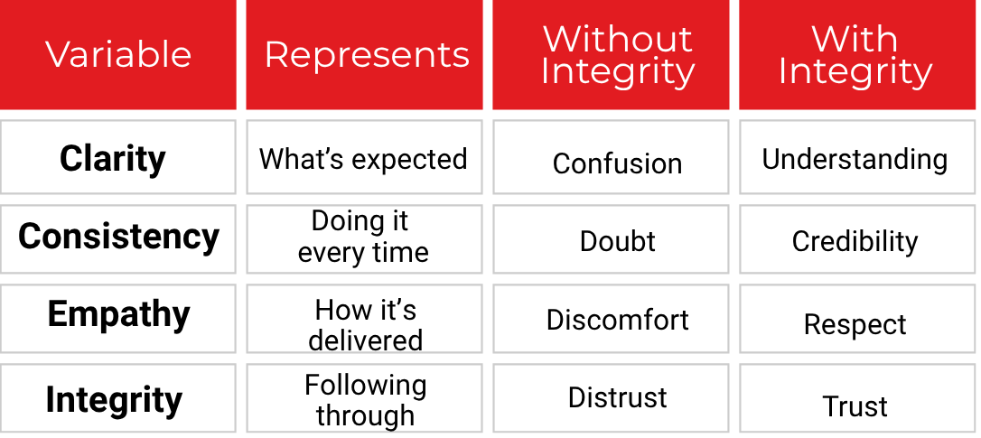 Integrity amplifies everything. Without it, clarity, consistency, and empathy lose power. Integrity is doing what you said you’d do, all the time, and even when it’s uncomfortable. That’s why it multiplies rather than adds.