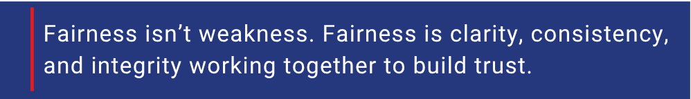 As leaders, we often confuse being “fair” with being agreeable or avoiding conflict. In truth, fairness is not about appeasement; rather, it’s about balance between truth and respect. When applied with steadiness and empathy, fairness becomes the foundation of trust. It tells your people, “You’ll get honesty, consistency, and respect here.”