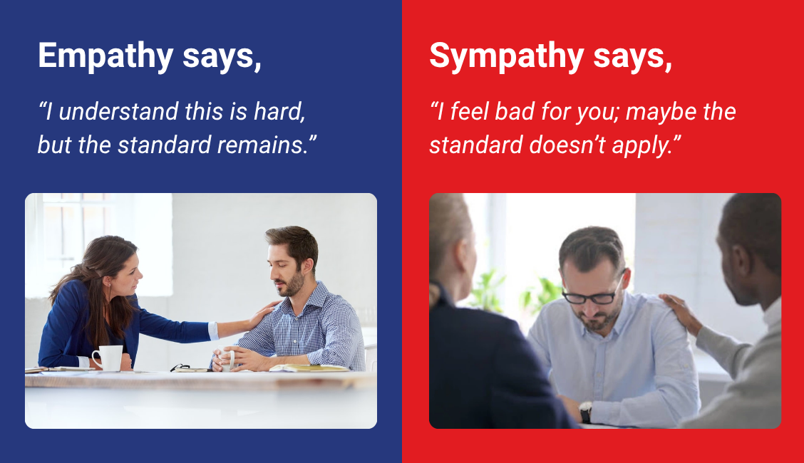 Empathetic delivery means you speak with calm authority and measured tone, not sympathy or apology. Sympathy softens accountability; empathy strengthens connection.