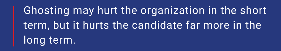 It appears from some research that at least one primary reason for ghosting stems from a desire to avoid conflict or discomfort. In a world of text communication, disappearing feels easier than saying no. For many, it may even feel harmless. But ghosting is not harmless. It has direct and lasting consequences, most of which candidates never see.